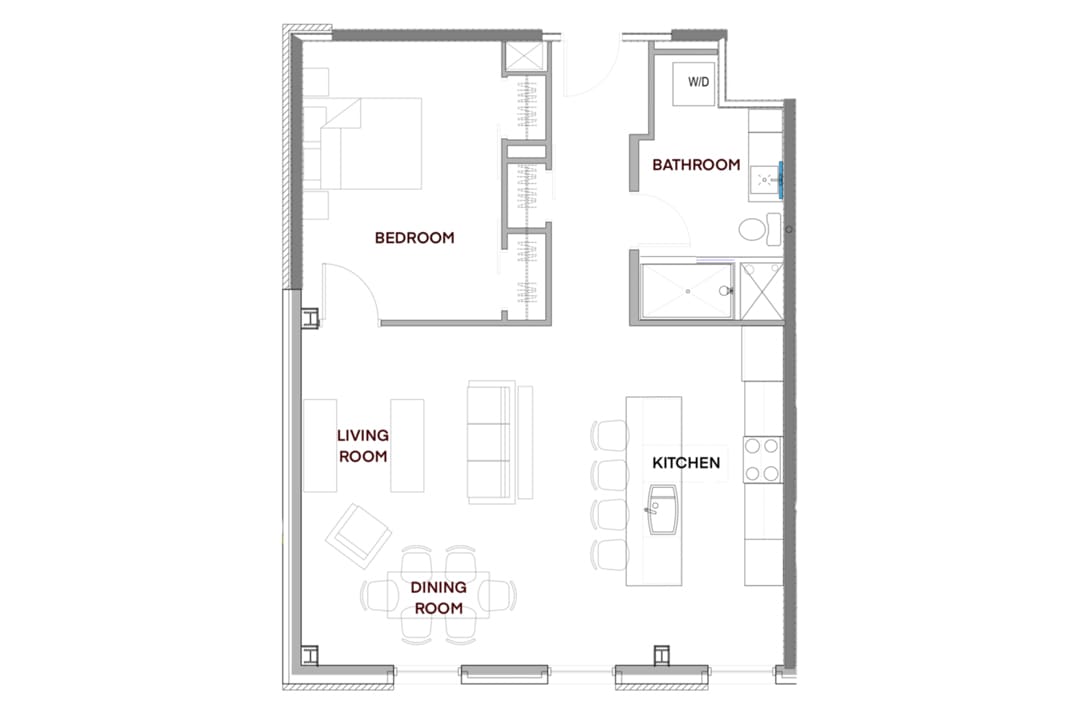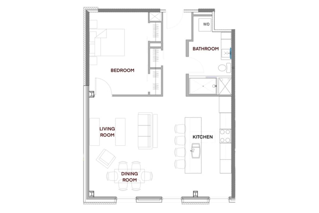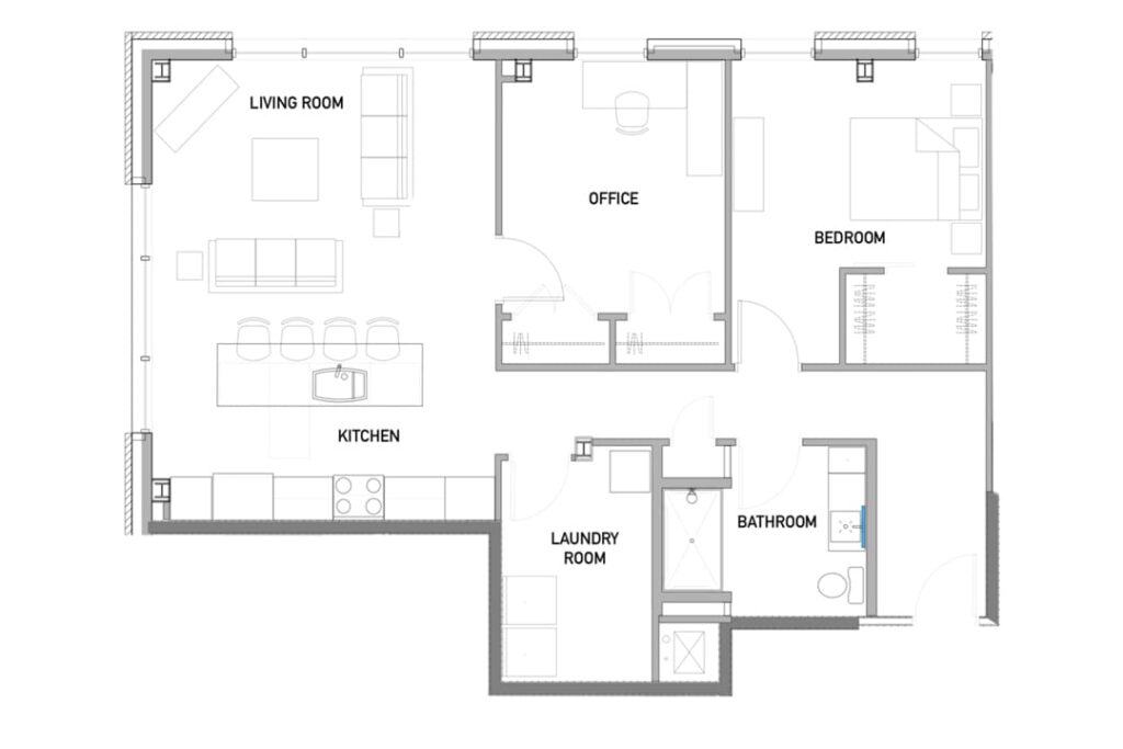 Each one-bedroom residence includes exquisitely appointed interiors including a kitchen island and a master suite with an expansive walk-in closet.